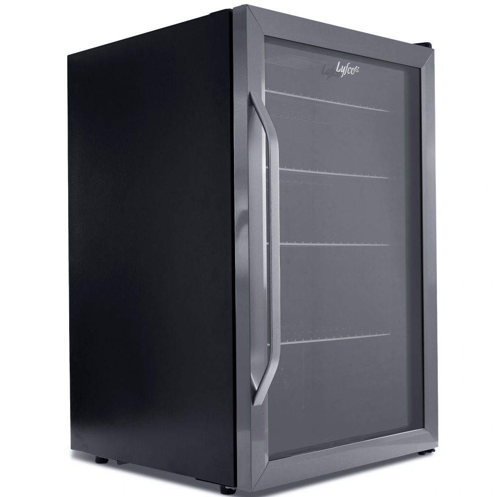 Kjøleren kommer i stilig klassisk sort design med LED-belysning inni og 3 trådhyller. Du stiller enkelt inn temperaturen med dreiekontrollen, det er fem ulike nivåer fra 3-13 °C. Takket være lavvibrasjonskompressoren er kjøleskapet nesten helt stille, med et støynivå på kun 41 dB. Døren er vendbar slik at du kan velge om du vil hengsle den til høyre eller venstre (merk dog at logoen på døren havner opp ned dersom du velger å snu døren).