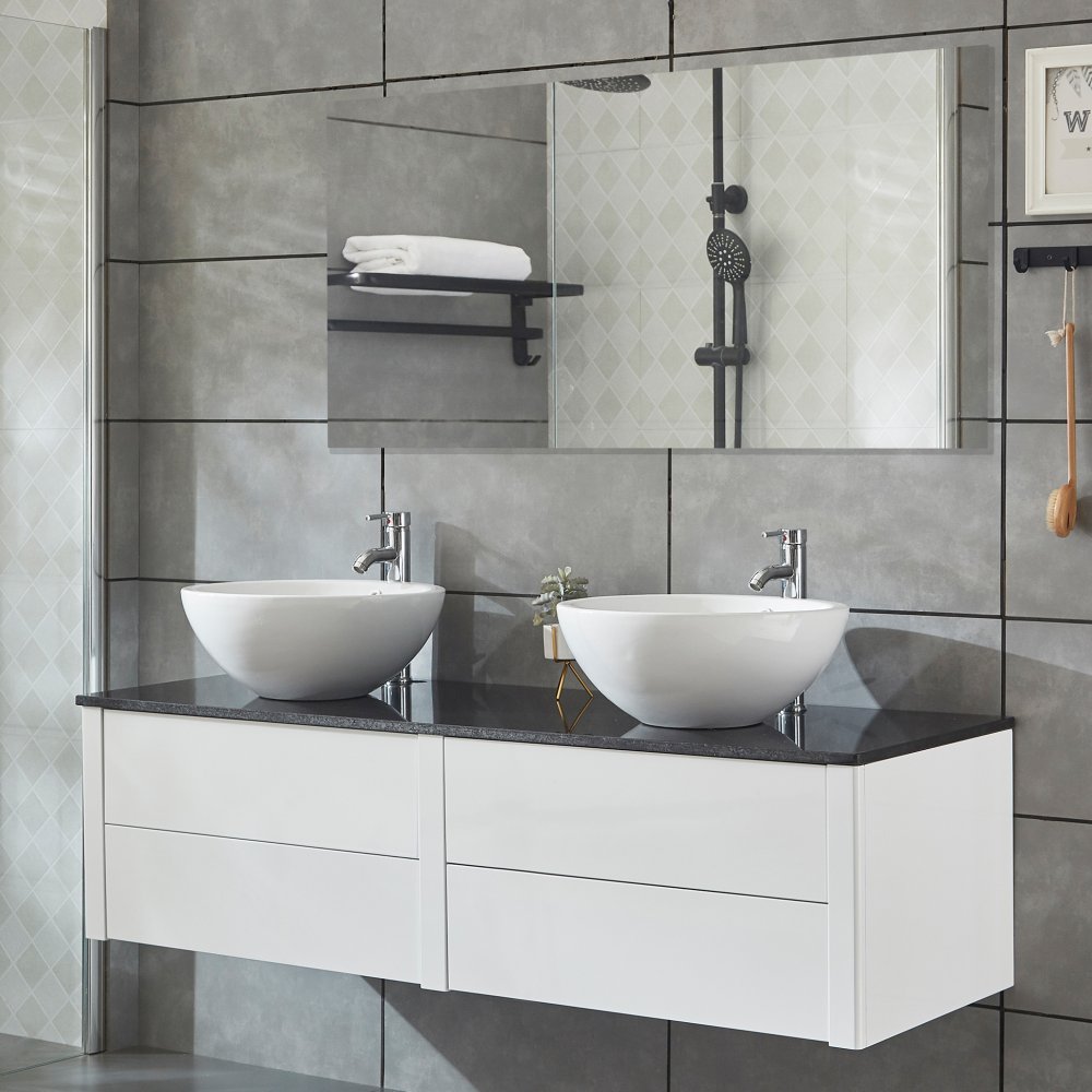Bredden på det medfølgende baderomsspeilet er lik bredden på skapet (150 cm), noe som gir et symmetrisk og rent utformet uttrykk. På benken rundt vasken er det godt med oppbevaringsplass for såpepumpe etc. Vaskeskålene er avrundet uten noen hjørner, noe som gjør dem enkle å holde rene. Kran og bunnventil er ikke inkludert, men kan kjøpes separat.