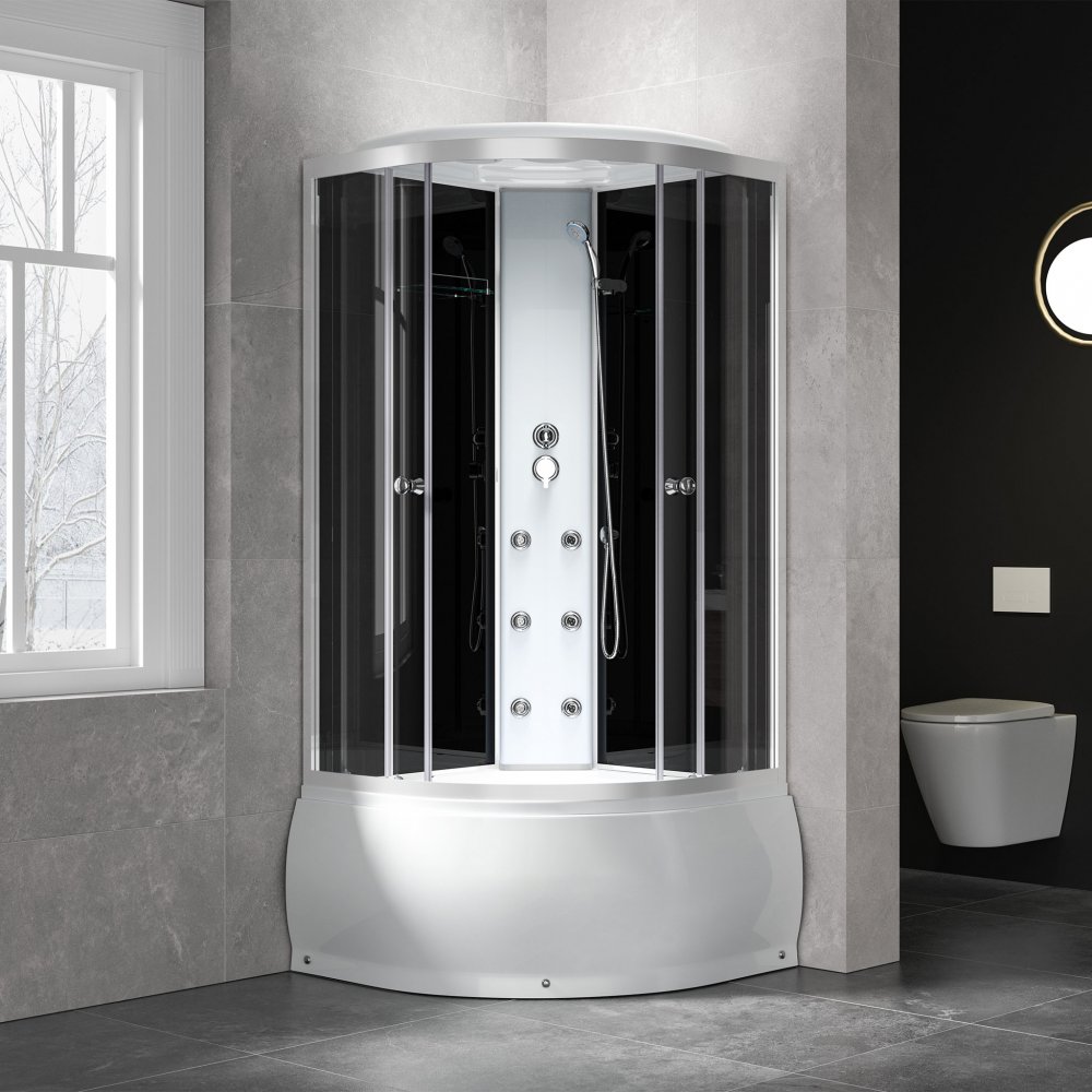 Elegant dusjkabinett med massasje som lar deg lage ditt eget hjemmespa! Dusjen er utstyrt med takdusj, hånddusj og seks dyser for ryggmassasje. Du kan enkelt bytte mellom disse funksjonene ved hjelp av dusjkontrollene. Dusjkabinettets mørke glassbakside skaper en matt og myk lysrefleksjon som er avslappende for øynene, samtidig som den bidrar til å binde designet sammen til en stilig helhet. Hytta har også et smart integrert sete ved siden av massasjedysene - alt du trenger for maksimal komfort!