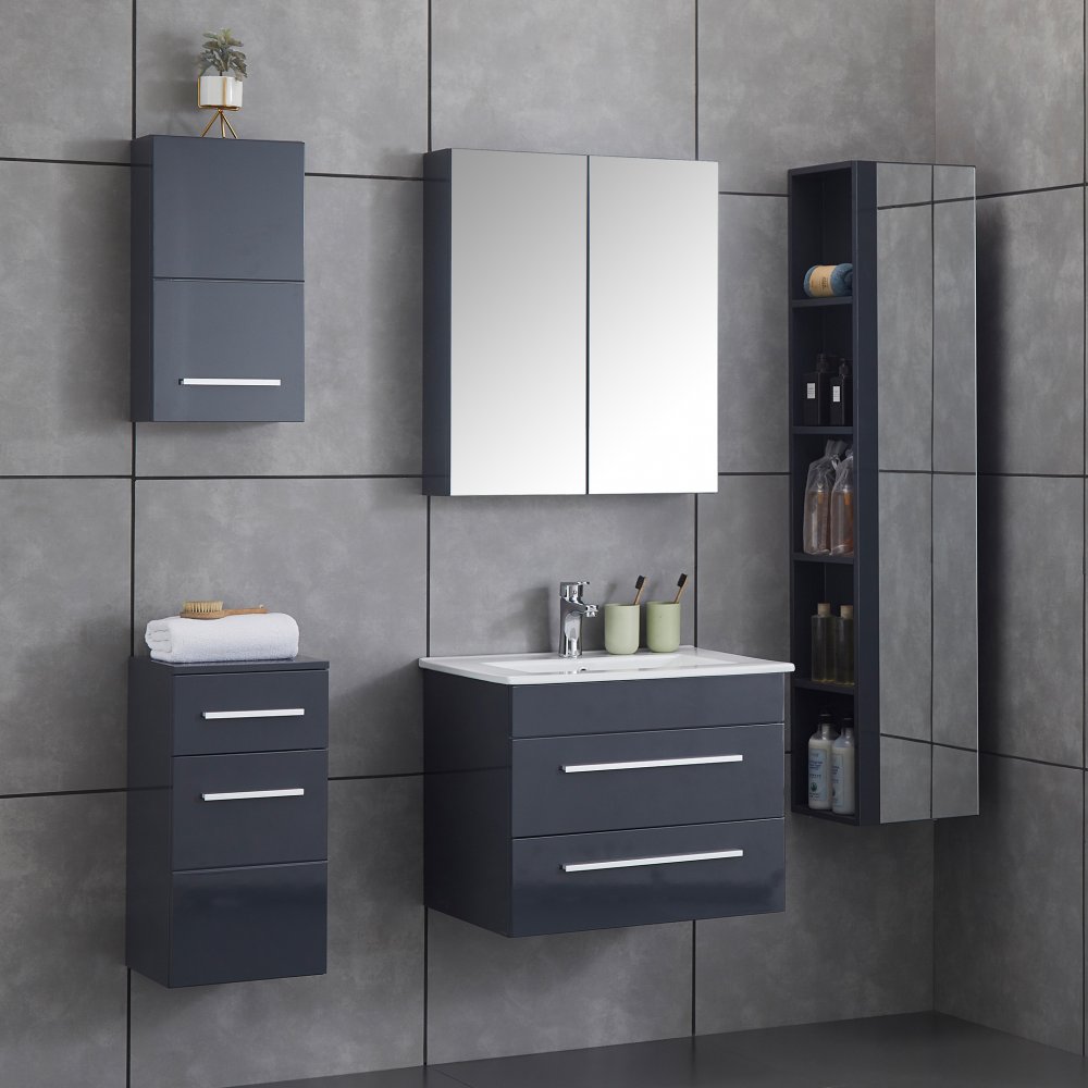 Møbelpakke for baderom i luksuriøs, moderne design i høyglans mørkegrå. Servantskap, høyskap med speil, sideskap, sideoverskap og speilskap. Møblenes stilige design fungerer godt på de aller fleste bad. Kommoden har en tynn, diskret keramisk vask i klassisk hvit med god oppbevaringsplass for såpepumpe etc. Vaskebollen er avrundet uten noen skarpe kanter, noe som gjør vasken lett å holde ren. Kran og bunnventil er ikke inkludert, men kan kjøpes separat.