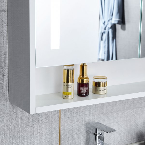 Speil- og oppbevaringsskapet er produsert i slitesterk MDF, og den integrerte LED-belysningen gir et behagelig, fremoverrettet lys som enkelt kan dimmes til ønsket lysstyrke.