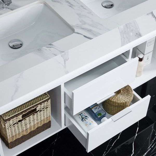 Denne baderomsmøbelet i hvitt har et elegant og moderne uttrykk som passer perfekt inn i de fleste baderom. Møbelet tilbyr god oppbevaringsplass med to uttrekkbare skuffer med soft-close-funksjon, samt ekstra oppbevaring på siden – ideelt for mindre håndklær og dekorative detaljer.