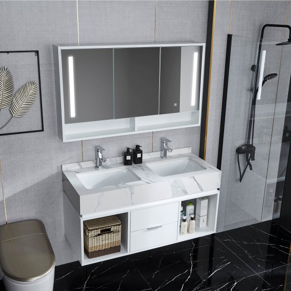 - Baderomsmøbel med LED-speilskap og doble servanter