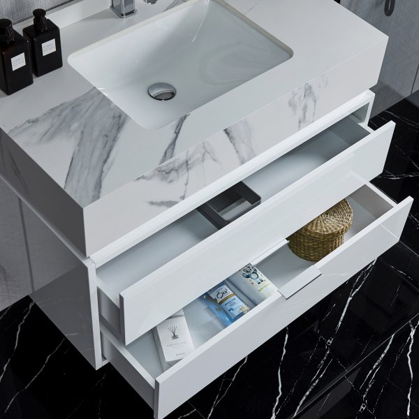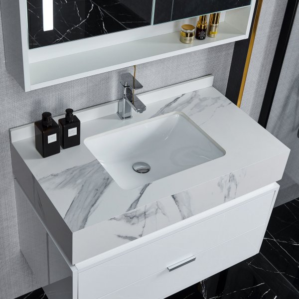 Baderomsmøbel med LED-speilskap og benkeplate i marmorert sinterstein