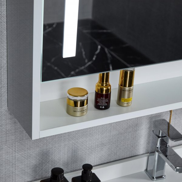 Speil- og oppbevaringsskapet i hvitt er produsert i slitesterk MDF, og den integrerte LED-belysningen gir et behagelig, fremoverrettet lys som enkelt kan dimmes til ønsket lysstyrke.