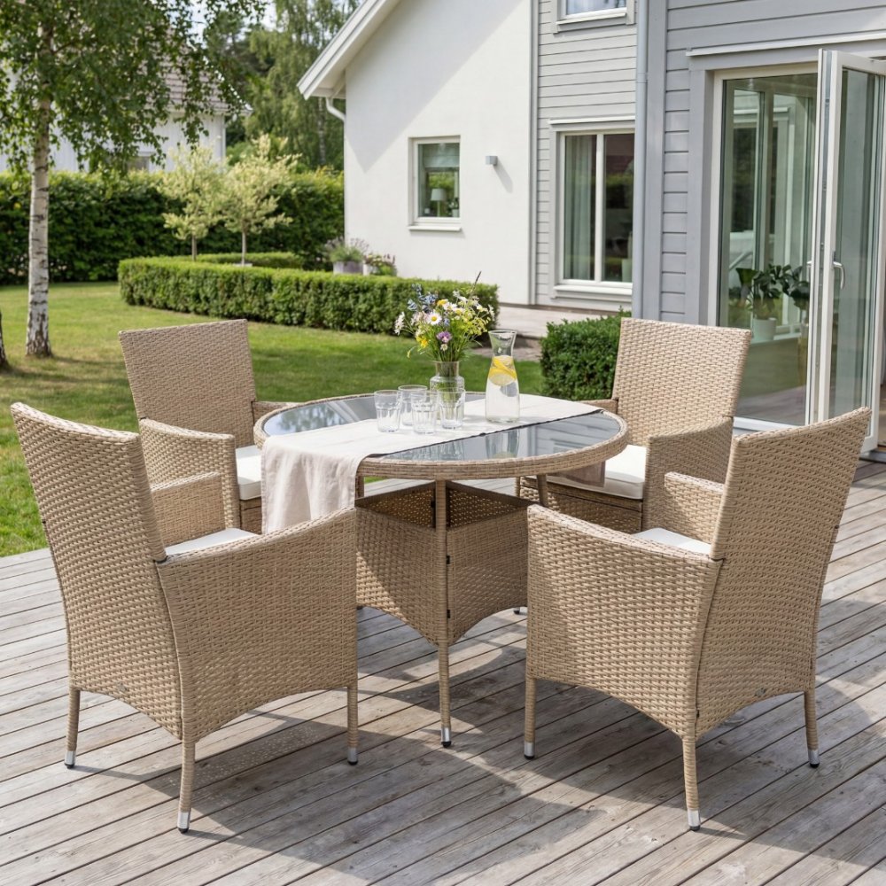 Stolene er laget av slitesterk kunstrotting (wicker) med pulverlakkert ramme, noe som gjør dem både stabile og værbestandige. De leveres med komfortable puter som gir ekstra sittekomfort og gjør at du sitter godt selv under lengre måltider. Den nøytrale fargepaletten gjør spisegruppen enkel å kombinere med ulike utemiljøer og stiler.