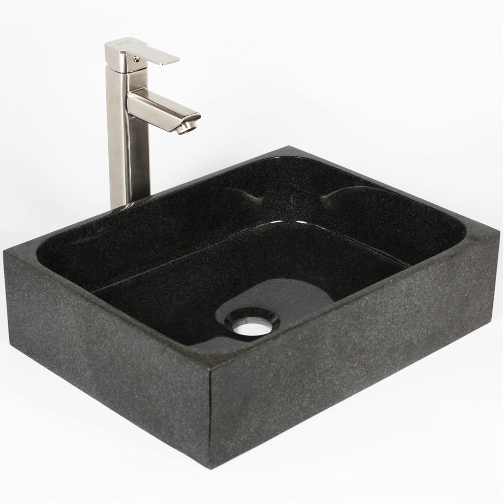 Eksklusiv frittstående vask laget av 100 % naturstein, sort granitt. Vasken er for plassering på benkeplaten og har en elegant, rektangulær design med myke linjer og en polert overflate uten noen skarpe hjørner og vinkler, noe som gjør vasken lett å holde ren.