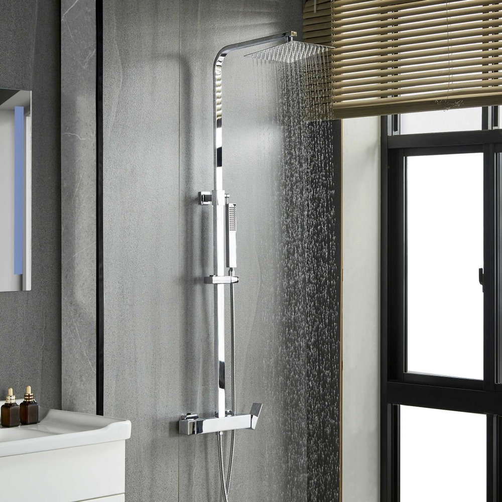 Dette takdusjsettet kombinerer en kantet og moderne form med klassisk kromfinish. Designet gir et stilrent uttrykk som passer både nøytrale og mer uttrykksfulle baderom.
