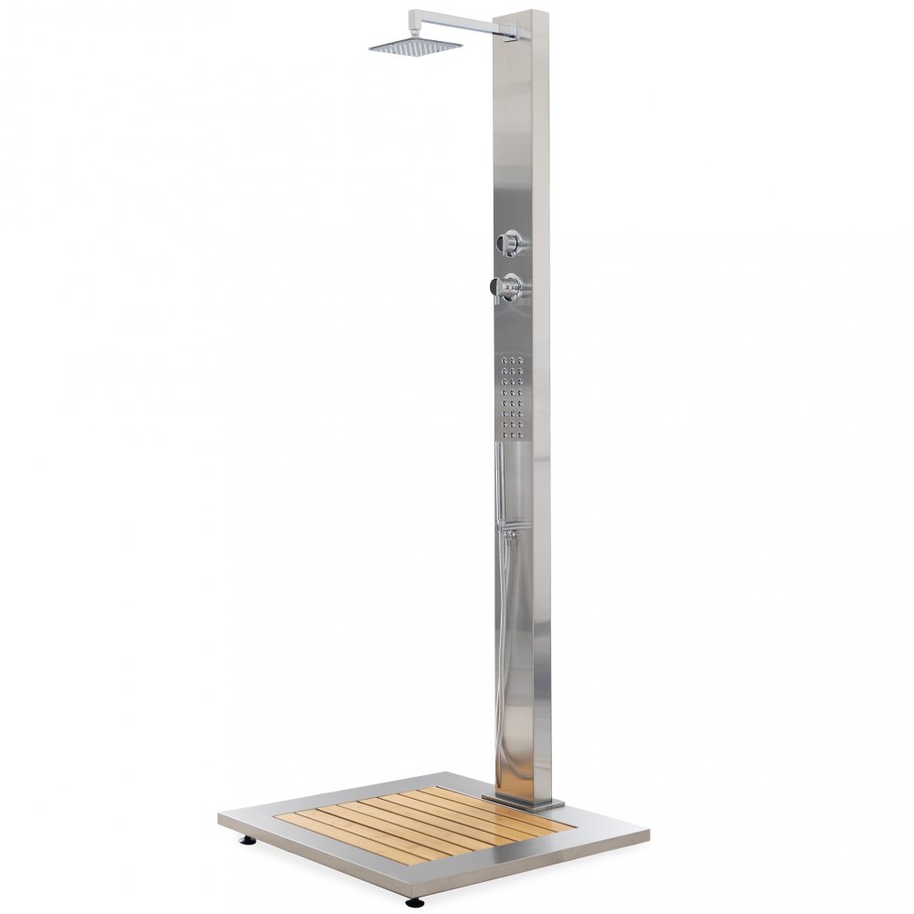 Komplett, multifunksjonell utendørs dusj i rustfritt stål med en stilig børstet overflate. Dusjen har en eksklusiv design med rette, moderne linjer og en bunnplate (80 x 80 cm) i bambus som er stilfullt innrammet i rustfritt stål. Panelet har både toppdusj og hånddusj, og du kan enkelt bytte mellom disse med dusjens kontroller. Utedusjen er også utstyrt med vertikale massasje-stråler som gir deg en eksklusiv spa-opplevelse i din egen hage!