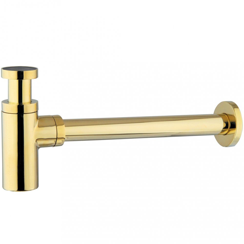 Stilig, stilig vannlås for vask/servant i gullfarget messing for tilkobling til vegg. Vannlåsen er justerbar i høyden. I dybden er dimensjonene tilpasset europeiske standarder. Men røret kan kuttes ved behov.